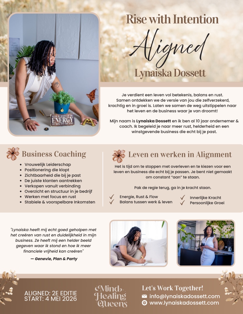 ALIGNED combineert high-level business begeleiding met diepgaand innerlijk werk. Mindset, strategie en praktische uitvoering komen samen in een concreet plan dat richting geeft, overzicht creëert en ruimte laat voor groei.